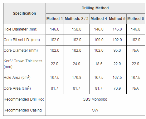GBS is particularly effective when high quality cores are required in clay, sand or loose, weak formations. The standard core of 102mm is completely retained in a clear PVC Coreliner and is easily extracted in one piece after each core run. The inner tube assembly latches inside the outer core barrel and is lifted to the surface by a overshot device connected to a wireline cable. The wireline retrieval method greatly improves production rates compared to conventional coring method but also leaves the borehole fully cased at all times ensuring borehole stability in sensitive geology. There are several different methods of using this core barrel: Method 1: For coring medium to hard formations. The bit setting is 146mm OD x 102mm ID. TC or diamond bits can be used depending on geology. Method 2:For coring in soft formations. TC bits are mainly used which consist of two parts – pilot and reamer. The reamer OD is 150mm and pilot ID is 102mm. Method 3: For coring in very soft or loose formations. The bits are the same as method 2 but a special extended core lifter case runs 25mm in front of the bit. Method 4: For coring in very soft or loose formations. The core lifter case is extended to run 60mm in front of the bit. The inner tube is spring loaded so that the core lifter case retracts behind the bit when harder formations are encountered. The bit setting is 146mm OD x 109mm ID Method 5:Shelby tube sampling of soft or very soft formations. This is an attachment that replaces the inner tube and has at the bottom end a shelby tube which samples ahead of the bit. The bit is same as method 1 Method 6: Full hole drilling assembly, this is an attachment that replaces the inner tube for non-coring purposes. The core bit is same as method 1 and the non-coring bit is 101.6mm diameter. For pilot coring ahead of the GBS barrel, it is possible to attach a smaller diameter core barrel (T6-101 or smaller) in place of the non-coring bit. Advantages: