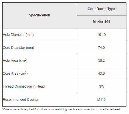 This core barrel has a spring-loaded inner tube assembly. When drilling in soft formations, the core lifter case protrudes up to 50mm in front of the bit, and acts as a cutting shoe. The soft core is protected from the water flush (see Figure a). When coring in harder materials, the spring loaded inner tube comes under pressure and the inner tube retracts, so now the core lifter case assumes a normal position (see Figure b). A PVC coreliner is used inside the inner tube to retain the core, and a “basket” catcher can be used to prevent soft materials from slipping out. This type of core barrel is used widely in some parts of Europe and Australasia and is reported to give 100% recovery in soft formations, such as sands, silts and marls. It is available in 101mm hole diameter (74mm core) and can be used in conjunction with T2-101 and T6-101 core barrels which are more suited for hard rocks. The 74 mm diameter core obtained with the mazier is compatible with the commonly used laboratory triaxial testing apparatus. Advantages: