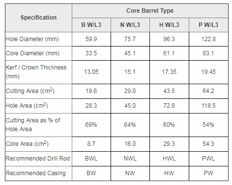 Core barrels that use the coreliner system require a special core bit, core lifter and (in some cases) special core lifter case, with a slightly smaller internal diameter than the standard type. This is because the core must be slightly smaller than usual in order to fit into the PVC coreliner. This is a very good technique that enhances the quality of core and overall core presentation, especially advantageous when coring sticky, broken and soft formations. It has become the « industry standard » core handling system in those locations where coreliner is readily available. Coreliner is supplied in standard 10ft (3.05m) lengths which are easily cut down with a hacksaw to 5ft (1.525m) lengths for use in 5ft /1.5m core barrels. Plastic caps are available to seal the ends of the coreliner tubes.. Advantages: