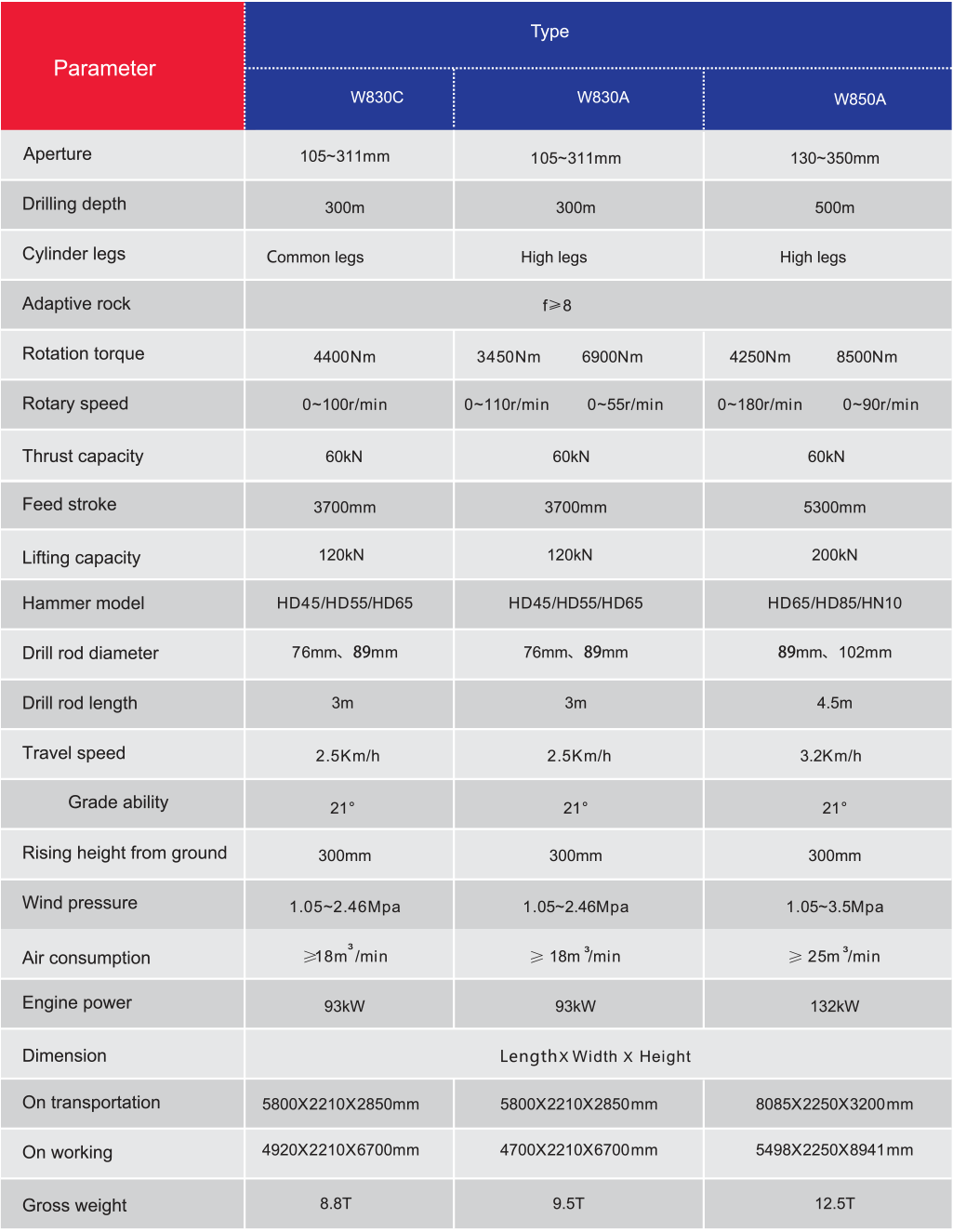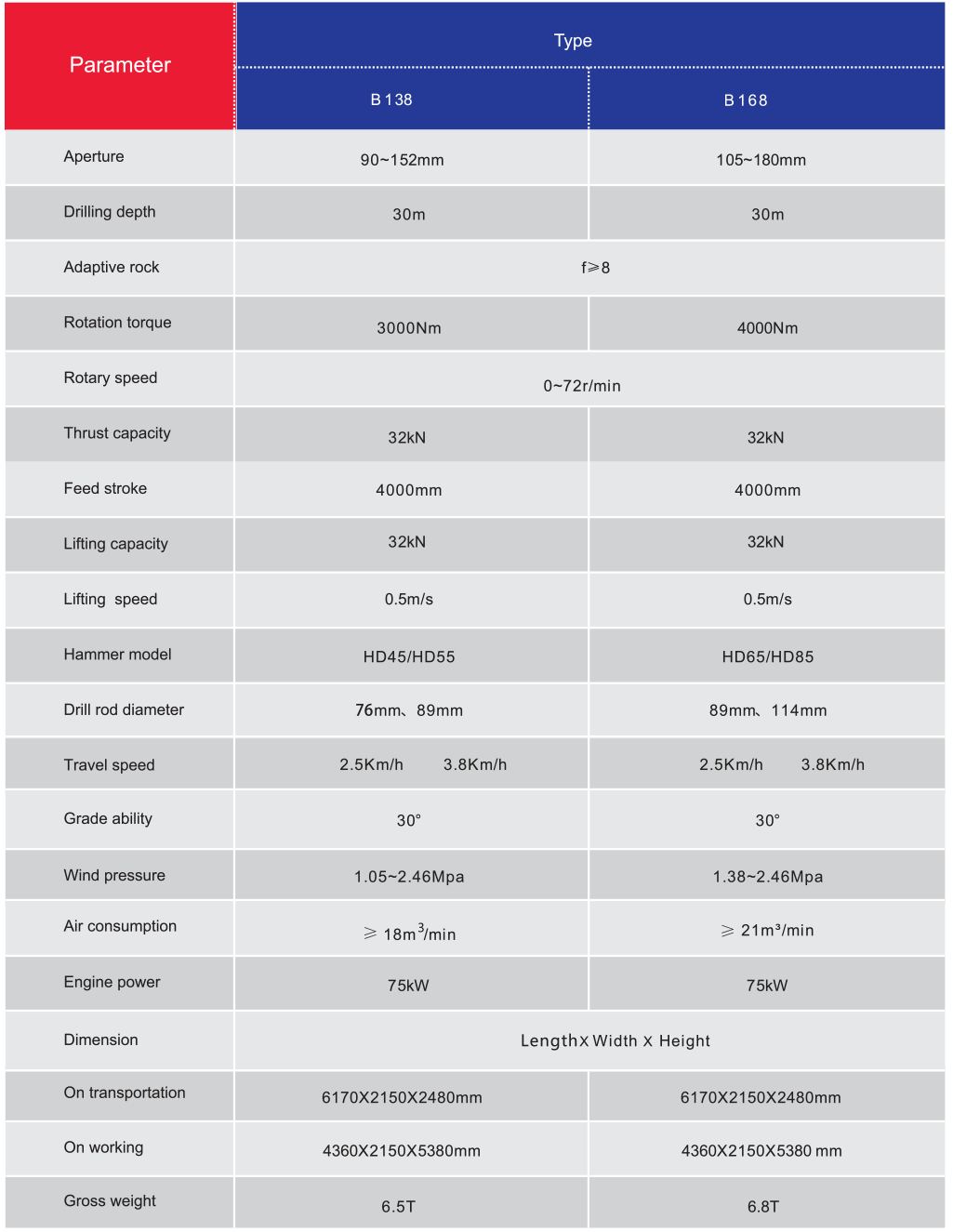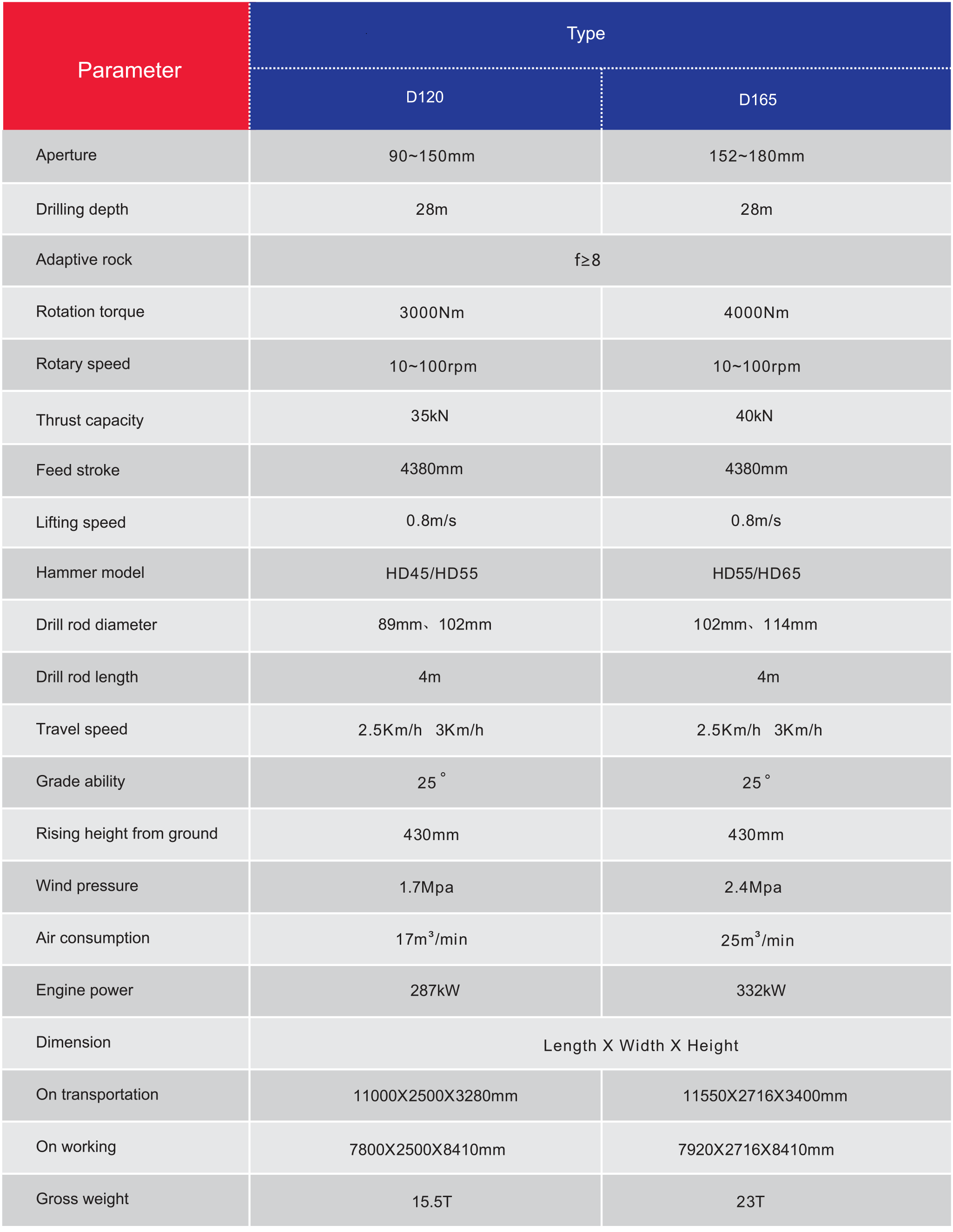 Hydraulic Open-Air Blast Hole Drilling Rig Parameters
