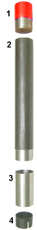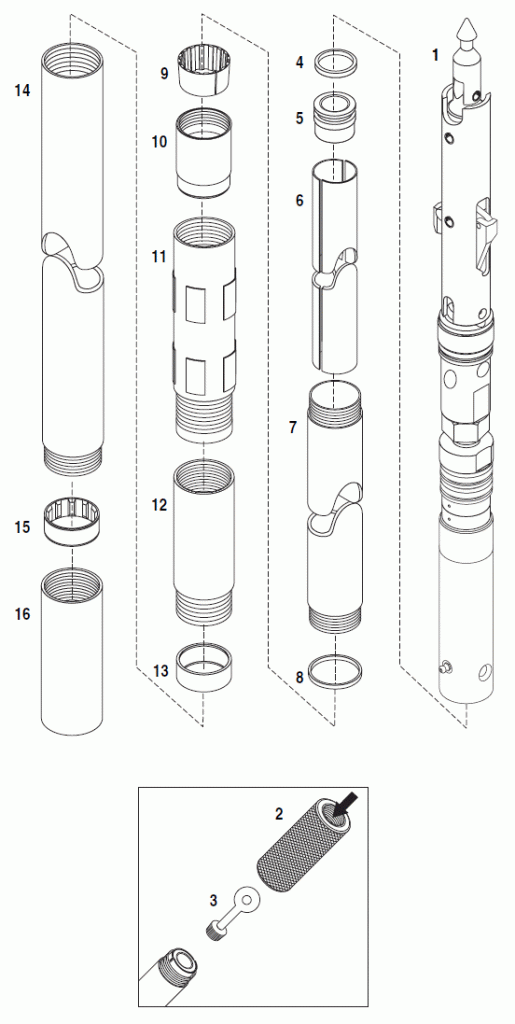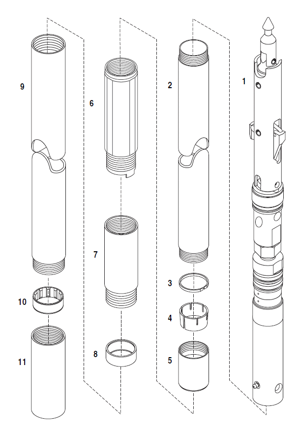 | 1. Core Barrel Head 2. Outer Tube 1.0m 3. Inner Tube 1.0m 4. PVC Coreliner 5. Basket Core Lifter 6. Cutting Shoe 7. T.C. Core Bit |
