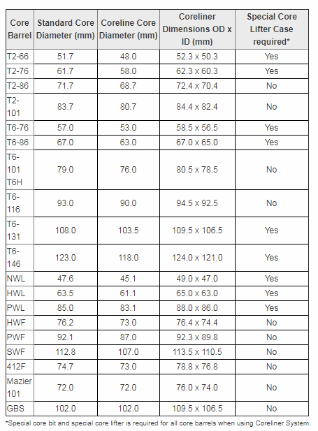 Core barrels that use the coreliner system require a special core bit, core lifter and (in some cases) special core lifter case, with a slightly smaller internal diameter than the standard type. This is because the core must be slightly smaller than usual in order to fit into the PVC coreliner. This is a very good technique that enhances the quality of core and overall core presentation, especially advantageous when coring sticky, broken and soft formations. It has become the « industry standard » core handling system in those locations where coreliner is readily available. Coreliner is supplied in standard 10ft (3.05m) lengths which are easily cut down with a hacksaw to 5ft (1.525m) lengths for use in 5ft /1.5m core barrels. Plastic caps are available to seal the ends of the coreliner tubes.. Advantages: