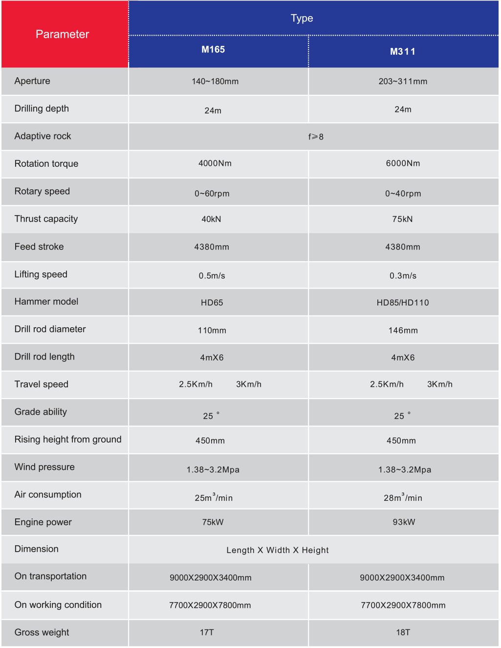 Hydraulic Open-Air Blast Hole Drilling Rig Parameters